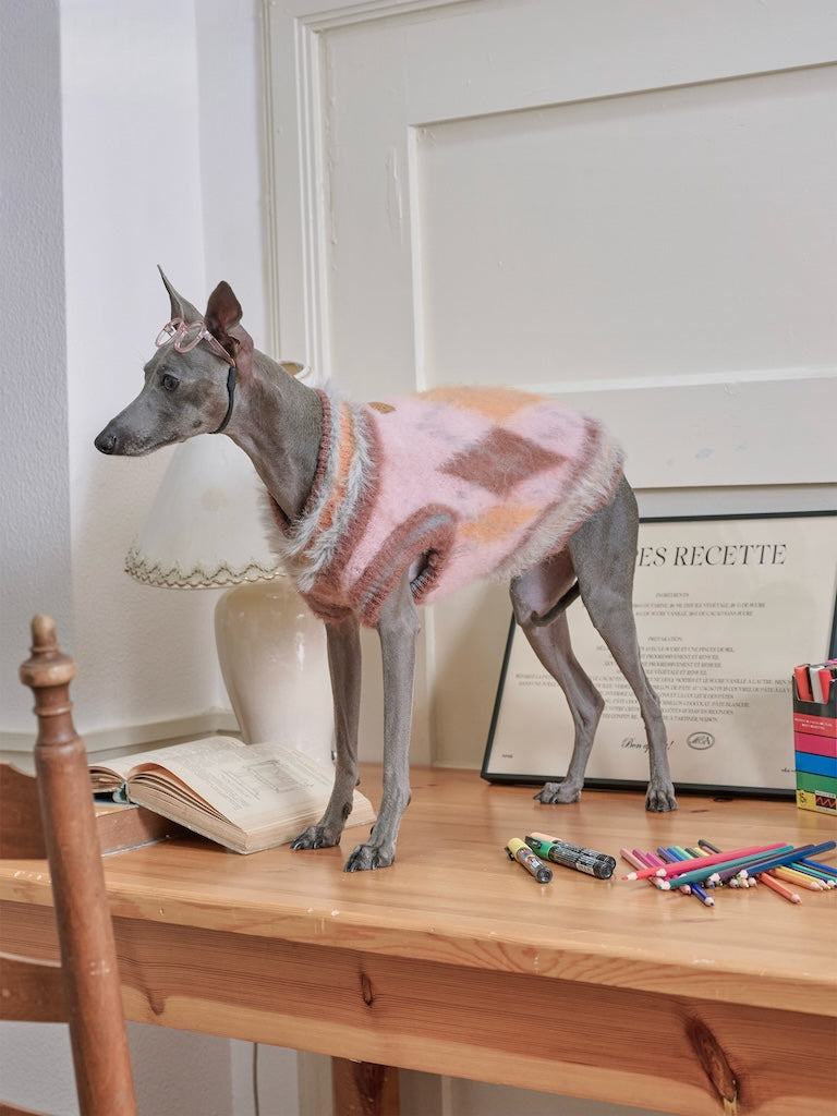 Inspired by classic British academia, our "Student Dog" vest combines diamond patterns with knit textures for scholarly charm. The elongated feather-like ribbing and mohair blend create dimensional texture, while full-brushed wool processing delivers cloud-soft comfort - like wearing a fluffy mousse cake!